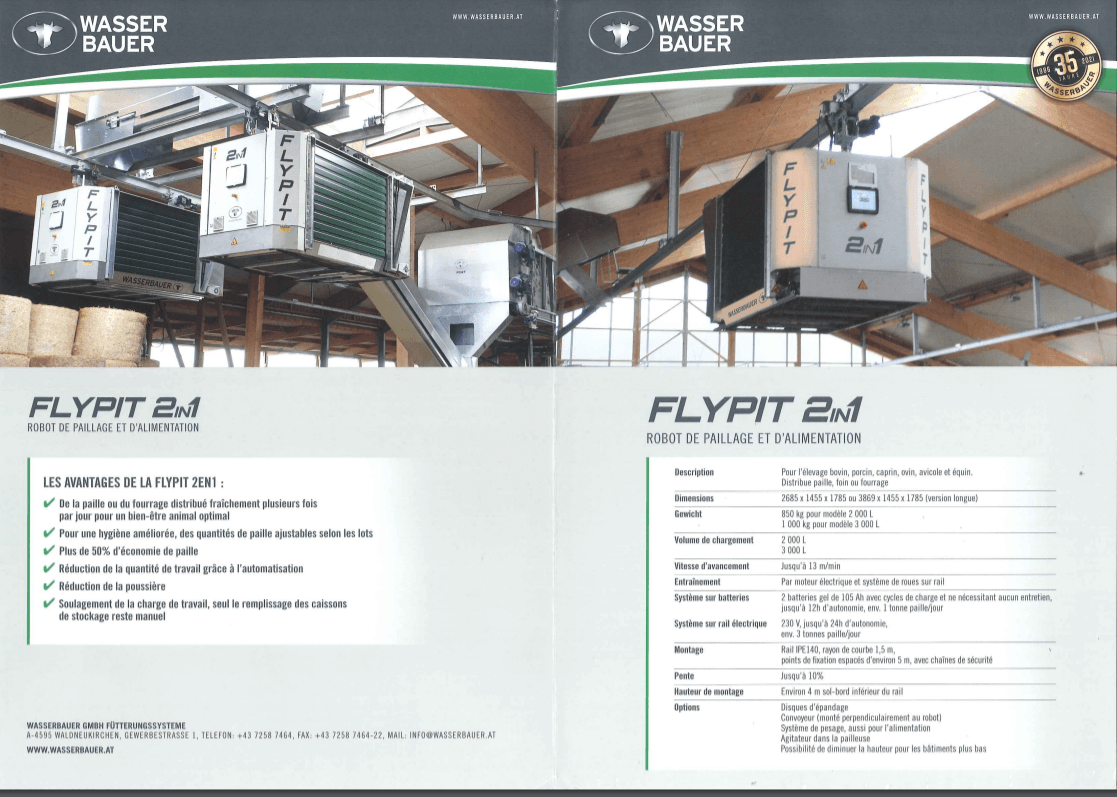 Grâce à un système de rail pouvant atteindre tous les recoins du bâtiment, la Flypit 2 en 1 distribue plusieurs fois par jour la paille fraîchement découpée
