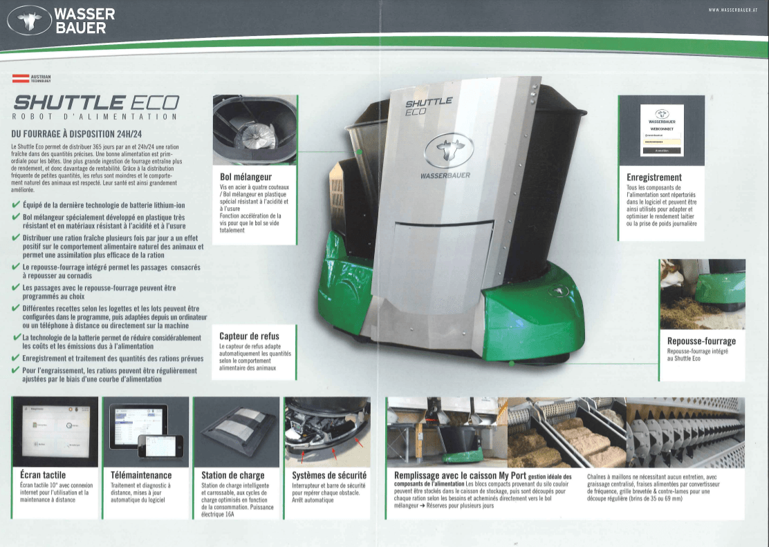 Le Shuttle Eco permet de distribuer 365 jours par an et 24h/24 une ration fraîche dans des quantités précises. Une bonne alimentation est primordiale pour les bêtes. Une plus grande ingestion de fourrage entraîne plus de rendement, et donc davantage de rentabilité. Grâce à la distribution fréquente de petites quantités, les refus sont moindres et le comportement naturel des animaux est respecté. Leur santé est ainsi grandement améliorée.
